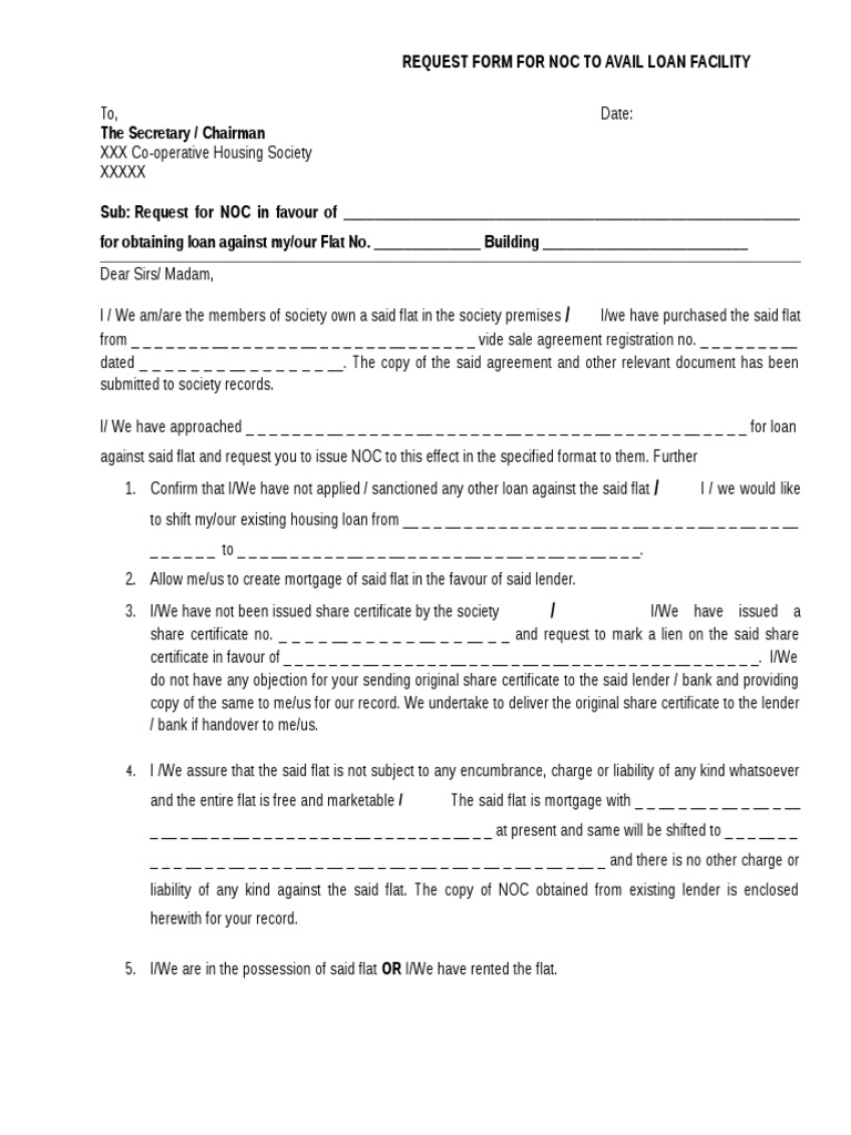 Request Letter From Society For Noc For Mortgage Loan From Bank Application for noc letter regarding transfer to home loan.